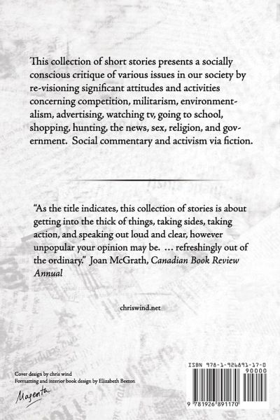 What if one's mandatory tour of duty was environmental rather than militaristic? Suppose all advertising had to tell the truth? Can you imagine sports without competition? ... ¿Social commentary and activism via fiction. "As the title indicates, this collection of stories is about getting into the thick of things, taking sides, taking action, and speaking out loud and clear, however unpopular your opinion may be. ... refreshingly out of the ordinary." Joan McGrath, Canadian Book Review Annual First edition published 1990; this is the second edition.