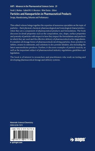 This edited volume brings together the expertise of numerous specialists on the topic of particles - their physical, chemical, pharmacological and toxicological characteristics - when they are a component of pharmaceutical products and formulations. The book discusses in detail properties such as the composition, size, shape, surface properties and porosity of particles with respect to how they impact the formulations and products in which they are used and the effective delivery of pharmaceutical active ingredients. It considers all dosage forms of pharmaceuticals involving particles, from powders to tablets, creams to ointments, and solutions to dry-powder inhalers, also including the latest nanomedicine products. Further, it discusses examples of particle toxicity, as well as the important subject of pharmaceutical industry regulations, guidelines and legislation. The book is of interest to researchers and practitioners who work on testing and developing pharmaceuticaldosageand delivery systems.
