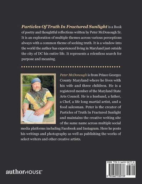 Peter McDonough is from Prince Georges County Maryland where he lives with his wife and three children. He is a registered member of the Maryland State Arts Council. He is a husband, a father, a Chef, a life long martial artist, and a food salesman. Peter is the creator and maintains Particles Of Truth In Fractured Sunlight as a creative writing page on multiple social media sites where he posts his writings, pictures as well as the works of other select artists.