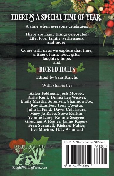 There is a special time of year. A time when everyone celebrates. There are many things celebrated: Life, love, family, selflessness, and more. Come with us as we explore that time, A time of fun, food, gifts, laughter, hope, And Decked Halls. Edited by Sam Knight With stories by: Arlen Feldman, Josh Morrey, Katie Kent, Donea Lee Weaver, Emily Martha Sorensen, Shannon Fox, Kay Hanifen, Tony Covatta, Julia LaFond, Dawn Colclasure, Mary Jo Rabe, Steve Ruskin, Yvonne Lang, Ronnie Seagren, Gretchen A Keefer, James Rogers, Fran Scannell, Richard Pulfer, Eve Morton, H.T. Ashmead