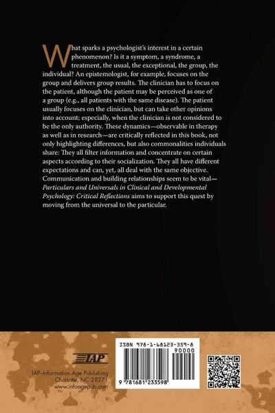 A volume in Perspectives on Human Development Series Editors: Dieter Ferring, Université du Luxembourg, Jaan Valsiner, Université du Luxembourg and Conchita D'Ambrosio, Université du Luxembourg What sparks a psychologist's interest in a certain phenomenon? Is it a symptom, a syndrome, a treatment, the usual, the exceptional, the group, the individual? An epistemologist, for example, focuses on the group and delivers group results. The clinician has to focus on the patient, although the patient may be perceived as one of a group (e.g., all patients with the same disease). The patient usually focuses on the clinician, but can take other opinions into account; especially, when the clinician is not considered to be the only authority. These dynamics - observable in therapy as well as in research - are critically reflected in this book, not only highlighting differences, but also commonalities individuals share: They all filter information and concentrate on certain aspects according to their socialization. They all have different expectations and can, yet, all deal with the same objective. Communication and building relationships seem to be vital - this book aims to support this quest by moving from the universal to the particular.