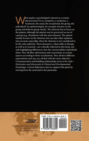 A volume in Perspectives on Human Development Series Editors: Dieter Ferring, Université du Luxembourg, Jaan Valsiner, Université du Luxembourg and Conchita D'Ambrosio, Université du Luxembourg What sparks a psychologist's interest in a certain phenomenon? Is it a symptom, a syndrome, a treatment, the usual, the exceptional, the group, the individual? An epistemologist, for example, focuses on the group and delivers group results. The clinician has to focus on the patient, although the patient may be perceived as one of a group (e.g., all patients with the same disease). The patient usually focuses on the clinician, but can take other opinions into account; especially, when the clinician is not considered to be the only authority. These dynamics - observable in therapy as well as in research - are critically reflected in this book, not only highlighting differences, but also commonalities individuals share: They all filter information and concentrate on certain aspects according to their socialization. They all have different expectations and can, yet, all deal with the same objective. Communication and building relationships seem to be vital - this book aims to support this quest by moving from the universal to the particular.