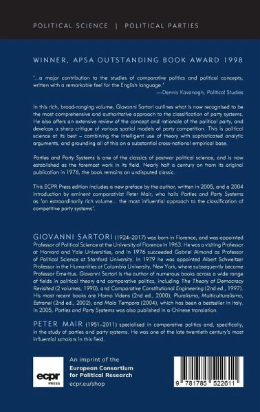 In this rich and broad-ranging volume, Giovanni Sartori outlines what is now recognised to be the most comprehensive and authoritative approach to the classification of party systems. He also offers an extensive review of the concept and rationale of the political party, and develops a sharp critique of various spatial models of party competition. This is political science at its best - combining the intelligent use of theory with sophisticated analytic arguments, and grounding all of this on a substantial cross-national empirical base. Parties and Party Systems is one of the classics of postwar political science, and is now established as the foremost work in its field. Author Biography Giovanni Sartori was born in Florence, Italy, in 1924, and was appointed Professor of Political Science at the University of Florence in 1963. He has been a visiting Professor in Harvard and Yale, and in 1976 he succeeded Gabriel Almond as Professor of Political Science in Stanford. In 1979 he was appointed Albert Schweitzer Professor in the Humanities at Columbia University, New York, where he is now Professor Emeritus. Giovanni Sartori is the author of numerous books across a wide range of fields in political theory and comparative politics, including Parties and Party Systems (1976), The Theory of Democracy Revisited (2 volumes, 1990), and Comparative Constitutional Engineering (2nd ed., 1997). His most recent books are Homo Videns (2nd ed., 2000), Pluralismo, Multiculturalismo, Estranei (2nd ed., 2002), and Mala Tempora (2004), which has been a bestseller in Italy. In 2005, Parties and Party Systems was also published in a Chinese translation.