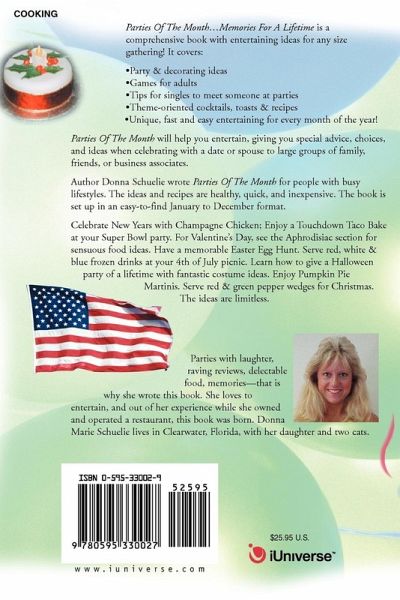 Parties Of The Month...Memories For A Lifetime is a comprehensive book with entertaining ideas for any size gathering! It covers: Party & decorating ideas Games for adults Tips for singles to meet someone at parties Theme-oriented cocktails, toasts & recipes Unique, fast and easy entertaining for every month of the year! Parties Of The Month will help you entertain, giving you special advice, choices, and ideas when celebrating with a date or spouse to large groups of family, friends, or business associates. Author Donna Schuelie wroteParties Of The Month for people with busy lifestyles. The ideas and recipes are healthy, quick, and inexpensive. The book is set up in an easy-to-find January to December format. Celebrate New Years with Champagne Chicken; Enjoy a Touchdown Taco Bake at your Super Bowl party. For Valentine's Day, see the Aphrodisiac section for sensuous food ideas. Have a memorable Easter Egg Hunt. Serve red, white & blue frozen drinks at your 4th of July picnic. Learn how to give a Halloween party of a lifetime with fantastic costume ideas. Enjoy Pumpkin Pie Martinis. Serve red & green pepper wedges for Christmas. The ideas are limitless.