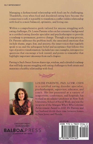Managing a dysfunctional relationship with food can be challenging. Thankfully, even when food and disordered eating have become the connection to self, it is possible to transform a conflict-ridden relationship with food to a more balanced, optimistic, and loving one. Within a comprehensive guide tailored for anyone struggling with eating challenges, Dr. Louise Parente relies on her extensive background as a certified eating disorder specialist and psychotherapist to provide a roadmap to permanent, positive change. Through a six-step process, Dr. Parente addresses the problem itself, the associated emotions that include shame, anger, fear, and anxiety; the inner-voices that regularly speak to us; and the subsequent belief and acceptance that follows this type of positive transformation. Included are case examples, introspective questions that encourage a look inward, and points to remember that highlight important takeaways from each chapter. Parting is Such Sweet Sorrow shares tips, wisdom, and a detailed roadmap that will help anyone struggling with eating challenges to both attain and maintain a healthy relationship with food.