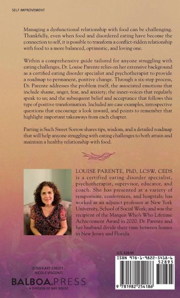 Managing a dysfunctional relationship with food can be challenging. Thankfully, even when food and disordered eating have become the connection to self, it is possible to transform a conflict-ridden relationship with food to a more balanced, optimistic, and loving one. Within a comprehensive guide tailored for anyone struggling with eating challenges, Dr. Louise Parente relies on her extensive background as a certified eating disorder specialist and psychotherapist to provide a roadmap to permanent, positive change. Through a six-step process, Dr. Parente addresses the problem itself, the associated emotions that include shame, anger, fear, and anxiety; the inner-voices that regularly speak to us; and the subsequent belief and acceptance that follows this type of positive transformation. Included are case examples, introspective questions that encourage a look inward, and points to remember that highlight important takeaways from each chapter. Parting is Such Sweet Sorrow shares tips, wisdom, and a detailed roadmap that will help anyone struggling with eating challenges to both attain and maintain a healthy relationship with food.
