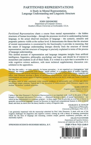One: Nuts and Bolts.- 1. Mental Representation.- Symbolism: The Classical Paradigm.- Cracks in the Symbolic Paradigm.- Connectionism: The Other Paradigm.- Methods of Models.- Assessing Theories of Mental Representation.- 2. Partitioned Representations.- General Overview.- The Contents of Spaces.- Parochial Reasoning.- Primary Contexts.- Partitioned Semantics.- Coherence.- Consolidation.- Secondary Contexts.- A Typology of Spaces.- Where Partitioned Representations Get Their Power.- Summary and Conclusions.- 3. Language: Process and Structure.- A Simple Philosophy of Language.- Linguistic Explanation.- The Process of Language Understanding.- Linguistic Evidence for Mental Representations.- 4. Three Levels of Language Processing.- Parochial Processing.- Distribution.- Contextualization.- An Example Discourse.- Conclusions.- Two: Studies in Language.- 5. Pedro's Donkey and Oedipus's Mother.- Some Common Parochial Linguistic Processes.- Some Common Cases of Distribution.- Interaction of Distribution and Parochial Processes.- Summary and Conclusions.- 6. Satisfying Presuppositions in Discourse.- The Problem of Presupposition.- Presupposition and Parochial Processing.- What Happens in Complex Sentences?.- Conclusions.- 7. Space Frogs and Henry Ford.- Linguistic Evidence for Contextualization.- The Semantic Contributions of Space Cues.- Summary.- 8. Temporal Aspect.- Reference Time: Temporal Perspective.- Semantics and Construction.- Reference Time: Contextualization.- The Case of the Present Perfect.- Conclusion.- 9. General Conclusions.- An Assessment of Partitioned Representations.- Prospectus.- The Importance of Partitioned Representations.- Appendices: Formal Models.- 10. A Logic of Partitioned Representations.- The Syntax of PR.- Rules of Inference for PR.- The Semantics of PR.- Soundness.- Conclusions.- 11. Generalized Natural Deduction.- Generalized Natural Deduction.- Time and Action.- Frames.- Summary and Conclusions.- 12. A Computational Model.- The Design of Spaceprobe.- Customizing Digestion.- Restructuring Rules for Distribution.- Handling Queries.- Language Understanding in Spaceprobe.- Summary.- References.- Author Index.