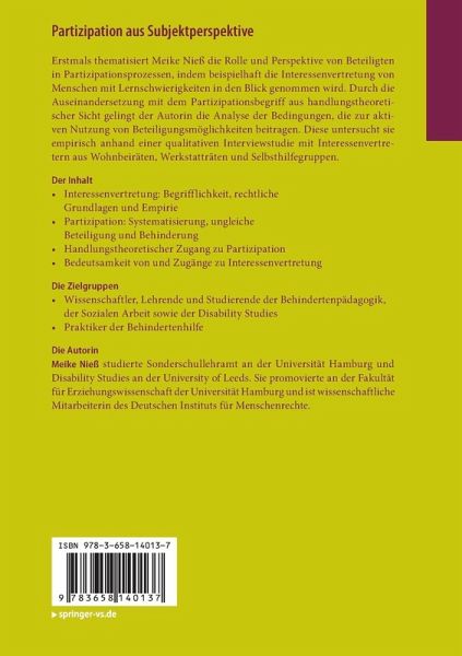 Erstmals thematisiert Meike Nieß die Rolle und Perspektive von Beteiligten in Partizipationsprozessen, indem beispielhaft die Interessenvertretung von Menschen mit Lernschwierigkeiten in den Blick genommen wird. Durch die Auseinandersetzung mit dem Partizipationsbegriff aus handlungstheoretischer Sicht gelingt der Autorin die Analyse der Bedingungen, die zur aktiven Nutzung von Beteiligungsmöglichkeiten beitragen. Diese untersucht sie empirisch anhand einer qualitativen Interviewstudie mit Interessenvertretern aus Wohnbeiräten, Werkstatträten und Selbsthilfegruppen.