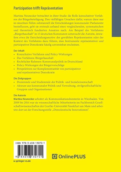 Martina Neunecker betrachtet in Ihrer Studie die Rolle konsultativer Verfahren der Bürgerbeteiligung. Den vielfältigen Ursachen dafür, warum diese nur in einzelnen Fällen substanziell die Entscheidungen kommunaler Parlamente beeinflussen, geht sie erstmals anhand eines vergleichenden, systematischen und theoretisch fundierten Ansatzes nach. Am Beispiel des Verfahrens "Bürgerhaushalt" in 13 deutschen Kommunen untersucht die Autorin, inwiefern etwa die Entscheidungsmotive der gewählten Repräsentanten oder der Kontext des Verfahrens dazu führen, dass Instrumente repräsentativer und partizipativer Demokratie häufig unvereinbar erscheinen.