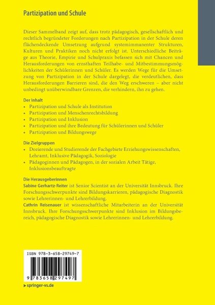 Dieser Sammelband zeigt auf, dass trotz pädagogisch, gesellschaftlich und rechtlich begründeter Forderungen nach Partizipation in der Schule deren flächendeckende Umsetzung aufgrund systemimmanenter Strukturen, Kulturen und Praktiken noch nicht erfolgt ist. Unterschiedliche Beiträge aus Theorie, Empirie und Schulpraxis befassen sich mit Chancen und Herausforderungen von ernsthaften Teilhabe- und Mitbestimmungsmöglichkeiten der Schülerinnen und Schüler. Es werden Wege für die Umsetzung von Partizipation in der Schule dargelegt, die verdeutlichen, dass Herausforderungen Barrieren sind, die den Weg erschweren - aber nicht unbedingt unüberwindbare Grenzen, die verhindern, ihn zu gehen.