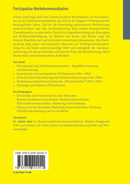 Juliane Apel fragt nach den Formen kreativer Partizipation von Konsumenten an der Werbekommunikation, die sich in der jüngeren Werbegeschichte herausgebildet haben. Ziel ist, die Entstehung partizipativer Werbeformen nachzuzeichnen und eine Systematisierung ihrer kreativ-konzeptionellen Charakteristika zu entwickeln. Durch die Gegenüberstellung mit Konzepten der Publikumsbeteiligung im Bereich von Kunst und Kultur zeigt die Autorin Parallelen auf und reflektiert existierende Erkenntnisse. Die Untersuchung trägt einen entscheidenden Baustein zur Werbegeschichtsschreibung bei, der bisher unberücksichtigt blieb und ermöglicht die Auseinandersetzung mit dieser besonders raffinierten Form der Beeinflussung, ihren Maskeraden und kontemporären Ästhetiken.