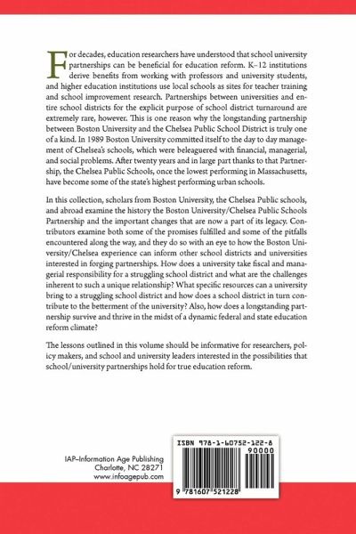 A volume in Research in Educational Policy: Local, National, and Global Perspectives Series Editor Kenneth K. Wong, Brown University For decades, education researchers have understood that school/university partnerships can be beneficial for education reform. K-12 institutions derive benefits from working with professors and university students, and higher education institutions use local schools as sites for teacher training and school improvement research. Partnerships between universities and entire school districts for the explicit purpose of school district turnaround are extremely rare, however. This is one reason why the longstanding partnership between Boston University and the Chelsea Public School District is truly one of a kind. In 1989 Boston University committed itself to the day to day management of Chelsea's schools, which were beleaguered with financial, managerial, and social problems. After twenty years and in large part thanks to that Partnership, the Chelsea Public Schools, once the lowest performing in Massachusetts, have become some of the state's highest performing urban schools. In this collection, scholars from Boston University, the Chelsea Public schools, and abroad examine the history the Boston University/Chelsea Public Schools Partnership and the important changes that are now a part of its legacy. Contributors examine both some of the promises fulfilled and some of the pitfalls encountered along the way, and they do so with an eye to how the Boston University/Chelsea experience can inform other school districts and universities interested in forging partnerships. How does a university take fiscal and managerial responsibility for a struggling school district and what are the challenges inherent to such a unique relationship? What specific resources can a university bring to a struggling school district and how does a school district in turn contribute to the betterment of the university? Also, how does a longstanding partnership survive and thrive in the midst of a dynamic federal and state education reform climate? The lessons outlined in this volume should be informative for researchers, policy makers, and school and university leaders interested in the possibilities that school/university partnerships hold for true education reform.