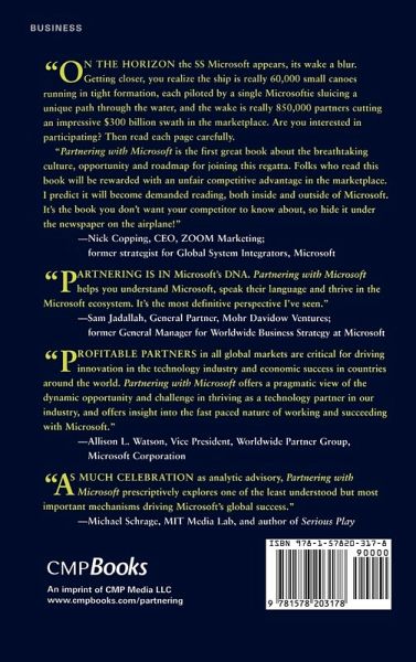Advance Praise for Partnering with Microsoft: ' Partnering with Microsoft is the first great book about the breathtaking culture, opportunity and roadmap for joining Microsoft's 850,000 partners cutting an impressive B swath in the marketpl This inside guide to effective partnering with Microsoft reveals how to become a trusted partner in order to gain supportive co-marketing, assured referrals, and joint success in selling complementary products and services.
