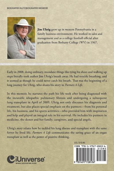 Early in 2008, doing ordinary, mundane things like tying his shoes and walking up steps literally took author Jim Uhrig's breath away. He had trouble breathing, and it seemed as though he could never catch his breath. That was the beginning of a long journey for Uhrig, who shares his story in Partners 4 Life. In this memoir, he narrates the path his life took after being diagnosed with the incurable idiopathic pulmonary fibrosis and undergoing a subsequent lung transplant in April of 2009. Uhrig not only discusses his diagnosis and treatment, but also places special emphasis on the partners-from his personal life, his business, and his sports activities-who provided him with inspiration and help and played an integral role in his survival. He includes his partners in medicine, the donor and her family, caregivers, and special angels. Uhrig's story relates how he tackled his lung disease and transplant with the same fervor he lived life. Partners 4 Life communicates the saving grace of an organ transplant as well as the power of positive thinking.