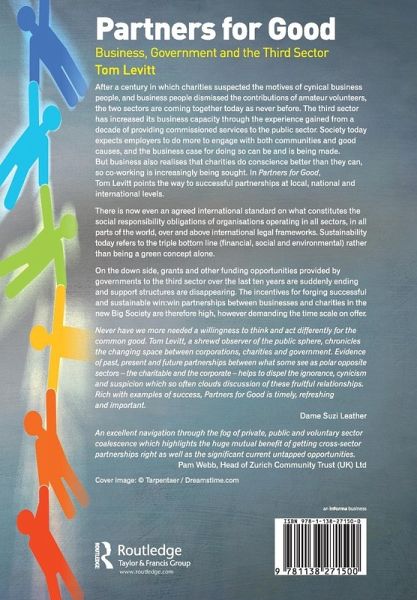 After a century in which charities suspected the motives of cynical business people, and business people dismissed the contributions of amateur volunteers, the two sectors are coming together today as never before. The third sector has increased its business capacity through the experience gained from a decade of providing commissioned services to the public sector. Society today expects employers to do more to engage with both communities and good causes and the business case for doing so can be and is being made. But business also realises that charities do conscience better than they can and so co-working is increasingly being sought. In Partners for Good, Tom Levitt points the way to successful partnerships at local, national and international levels. There is now even an agreed international standard on what constitutes the social responsibility obligations of organisations operating in all sectors, in all parts of the world, over and above international legal frameworks. Sustainability today refers to the triple bottom line (financial, social, environmental) rather than being a green concept alone. On the down side, grants and other funding opportunities provided by governments to the third sector over the last ten years are suddenly ending and support structures are disappearing. The incentives for forging successful and sustainable win:win partnerships between businesses and charities in the new Big Society are therefore high, however demanding the time scale on offer.
