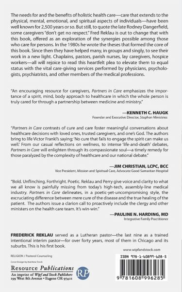 The needs for and the benefits of holistic health care--care that extends to the physical, mental, emotional, and spiritual aspects of individuals--have been well known for 2,500 years or so. But still, to quote the late Rodney Dangerfield, some caregivers "don't get no respect." Fred Reklau is out to change that with this book, offered as an exploration of the synergies possible among those who care for persons. In the 1980s he wrote the theses that formed the core of this book. Since then they have helped many, in groups and singly, to see their work in a new light. Chaplains, pastors, parish nurses, lay caregivers, hospice workers--all will rejoice to read this heartfelt plea to elevate them to equal status with the vital care-giving services performed by physicians, psychologists, psychiatrists, and other members of the medical professions.