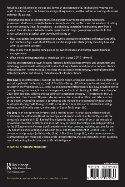 Elma Levy is an entrepreneur, investor, leadership coach, and public speaker. She is cofounder and principal (with her husband Dov) of The Eldov Group, LLC, a boutique investment and startup advisory in the Washington, D.C. area. As an advisor to entrepreneurs, Ms. Levy provides advice on corporate governance, financial management, and tactical planning. In 2000, she cofounded Dovel Technologies, building and supporting information technology (IT) systems for the U.S. government. Over the next 18 years, she served as chief executive officer, and later as chair of the board, overseeing corporate governance and managing the company's infrastructure development and growth through its 2019 acquisition. She is also a credentialed leadership, wellness, and life skills coach, and founder of Coach To Strength LLC. Dov Levy is an entrepreneur, investor, and a leading expert in large-scale, mission-critical IT solutions. He cofounded Dovel Technologies and served as its chief technologist until the company's acquisition in 2019, remaining a dynamic leader at the forefront of technological innovations. Over the past three decades, Mr. Levy served in technology leadership positions for the U.S. government's most significant mission-critical projects, including systems for the U.S. Securities and Exchange Commission (SEC) and the Department of Defense (DoD). He is cofounder and principal (with his wife, Elma) of The Eldov Group, LLC, and a senior advisor for GrantSolutions.gov, managing a large-scale implementation of cloud computing, event sourcing, machine learning, blockchain, and artificial intelligence.
