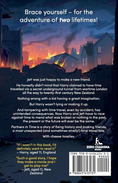 Brace yourself for the adventure of two lifetimes! Jett was just happy to make a new friend. He honestly didn't mind that Harry claimed to have time travelled via a secret underground tunnel from wartime London all the way to twenty-first century New Zealand. Nothing wrong with a kid having a great imagination. Except Harry wasn't lying or making it up. There really was a tunnel. An impossible link between the past and the future. But tampering with time travel, even by accident, has unintended consequences. Now Harry and Jett have to race against time to mend what was broken or nothing in the past, the present or the future will ever be the same. An unlikely adventure that will make... or break... history. Partners in Time is a story of fixing history and making friends, a most unexpected (and sometimes smelly!) time travel tale. With cheese toasties. "If I wasn't in this book, I'd definitely want to read it." - Harry, aged 11. England "Such a good story, I hope they make a movie, and I get to play me!" - Jett, aged 11, New Zealand