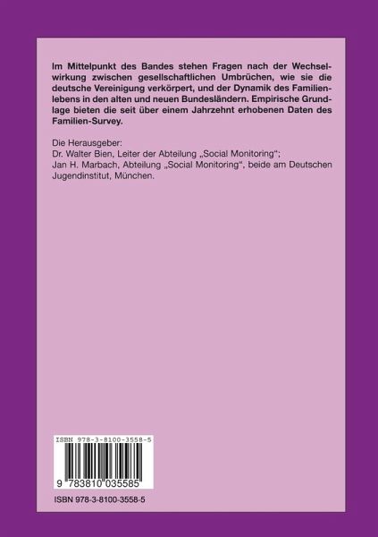 Im Mittelpunkt des Bandes stehen Fragen nach der Wechselwirkung zwischen gesellschaftlichen Umbrüchen, wie sie die deutsche Vereinigung verkörpert, und der Dynamik des Familienlebens in den alten und neuen Bundesländern. Empirische Grundlage bieten die seit über einem Jahrzehnt erhobenen Daten des Familien-Survey.
