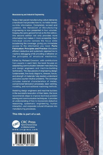 This book, volume three of the second edition of the comprehensive Handbook of Manufacturing Engineering, focuses on establishing essential communication between manufacturing and design engineers. Such communication is essential to ensure effective debugging of machinery, a critical, methodical procedure used to uncover and eliminate problems encountered in the initial startup. The book suggests efficient deductive and systematic approaches to machine debugging while providing a refresher on the principles of structural mechanics. Coverage then extends to material characteristics of metals, conventional fabrication processes, laser welding, modeling, and nontraditional machining methods.