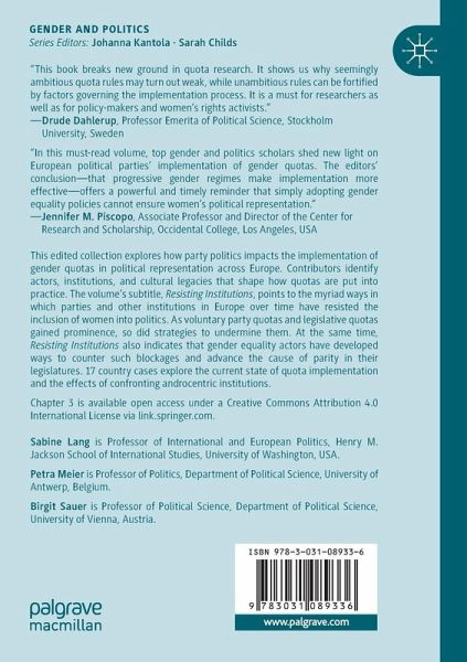 1. Party Politics and the Implementation of Gender Quotas: Resisting Institutions.- 2. Practices and Strategies of Gender Representations in Danish Political Parties.- 3. How Gender Quotas Work in Switzerland.- 4. Nested Newness and Critical Junctures: Quota Implementation Flaws in the Austrian Party Democracy.- 5. From Party Quotas to Parity? Legislative Gender Representation in Germany at a Crossroads.- 6. Implementing Special Measures for Political Representation and Gender in Sweden.- 7. The Implementation of Equality-Based Candidate Selection Decisions in the British Labour and Conservative Parties.- 9. 25 Years of Gender Quotas, still a Man's World? Implementation in the Belgian Case.- 10. Only Stand-ins? Women's Parliamentary Representation and Quota Implementation in Croatia since 2011.- 11. Twenty Years of Parité under the Microscope in France: parties Play with rather than by the Rules.- 12. Ireland: Understanding Gender Quotas as a Stepping-Stone to Gender Transformation and Empowerment.- 13. Gender Quota and Local Political Parties: Varieties of Implementation in Italy.- 14. The Least That Could Have Been Done? The Ambiguous Effects of Gender Quotas in Polish Parliamentary Elections.- 15. Implementing Gender Quotas in Portugal - a Success Story?.- 16. Legislative Quotas and Political Representation in Serbia.- 17. Legislative Gender Quotas in Slovenia - Implemented but not Internalized.- 18. "It's the Party, Stupid!": Success of and Resistance to Gender Quotas in Spain.
