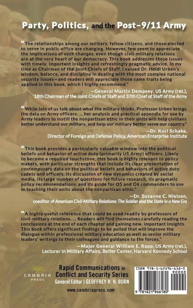 *This book is in the Rapid Communications in Conflict and Security (RCCS) Series (General Editor: Dr. Geoffrey R.H. Burn). Throughout the existence of the All-Volunteer Force, but chiefly since the 1990s, the military has faced charges of growing politicization.During periods of heightened partisan polarization-and the inevitable civil-military relations turmoil that ensues-such charges tend to be asserted more frequently, even if the term and what it might constitute remains vague. While civilian political leaders on both sides of the aisle arguably bear much of the responsibility for any politicization of the armed forces, this book examines the extent to which those in uniform may have contributed to its gradual politicization and the erosion of the military's nonpartisan ethic. Drawing upon original survey research of active-duty US Army officers conducted at various junctures over the past decade, this book explores the partisan and political attitudes of the officer corps. It examines the types of political activities officers engage in-including their expressed opinions on politics on social media-and whether such activities are in keeping with the norm of nonpartisanship and Department of Defense directives that govern political behavior. This data-rich volume includes more than 40 tables presenting helpful snapshots of information. The book also explores how active-duty officers view politically outspoken retired flag officers, including whether the norm of nonpartisanship should extend into retirement. In addition, the book examines critical issues such as the impact of partisan political attitudes of officers on their views of civil-military relations, the roles senior military leaders and civilian policymakers should play during wartime, and the institution of the armed forces itself. This book closes with recommendations for policymakers, along with an invaluable teaching resource for those in uniform today-a practical guide for how commanders can instill the nonpartisan ethic at the unit level, complete with recommended readings and proposed discussion questions. Given the scant attention paid to civil-military relations in formal professional military education settings, this guide is a helpful and valuable reminder that norms in any institution are only maintained through careful, continuous teaching and reinforcement. Party, Politics, and the Post-9/11 Army is an important resource for military professionals and scholars and practitioners of civil-military relations, including senior military leaders and defense department officials. This book will be especially valuable for students enrolled in professional military education, particularly those attending senior service colleges, as well as students (both military and civilian) taking undergraduate- and graduate-level courses in national security studies.