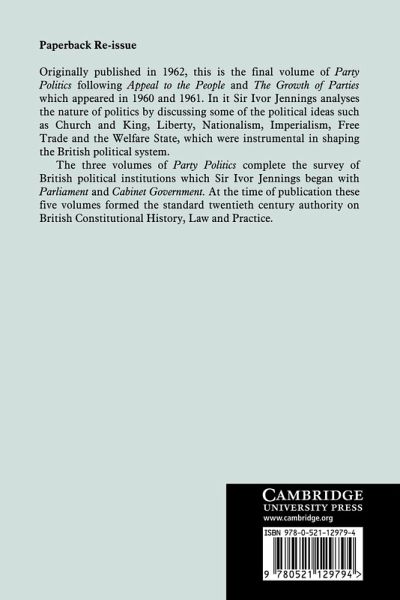 Originally published in 1962, this is the final volume of Party Politics following Appeal to the People and The Growth of Parties, which appeared in 1960 and 1961. In it Sir Ivor Jennings analyses the nature of politics by discussing some of the political ideas such as Church and King, liberty, nationalism, imperialism, free trade and the welfare state, which were instrumental in shaping the British political system. The three volumes of Party Politics complete the survey of British political institutions which Sir Ivor Jennings began with Parliament and Cabinet Government. At the time of publication these volumes formed the standard twentieth century authority on British Constitutional history, law and practice.