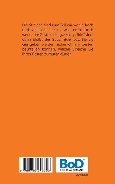 Die Streiche sind zum Teil ein wenig frech und vielleicht auch etwas derb. Doch wenn Ihre Gäste nicht gar so "spröde" sind, dann bleibt der Spaß nicht aus. Sie als Gastgeber werden sicherlich am besten beurteilen können, welche Streiche Sie Ihren Gästen zumuten dürfen.