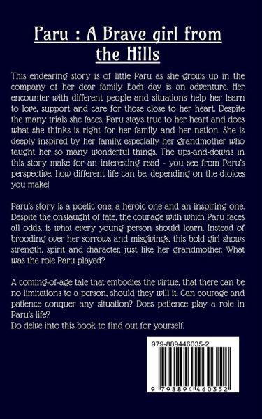 This endearing story is of little Paru as she grows up in the company of her dear family. Each day is an adventure. Her encounter with diverse people and situations help her learn to love, support, and care for those close to her heart. Despite the many trials she faces, Paru stays true to her heart and does what she thinks is right for her family and her nation. She is deeply inspired by her family, especially her grandmother who taught her wonderful things. The ups-and-downs in this story make for an interesting read - you see from Paru's perspective, how different life can be, depending on the choices you make!