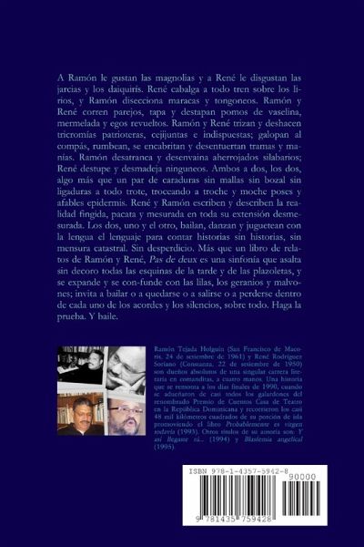 Pas de deux deviene en algo así como el verdadero placer de la escritura en su máxima expresión, y a cuatro manos; un libro para gozarlo a plenitud y leerlo todas las veces cuanto el lector y el placer quieran darse la mano. Hace unos años, Ramón Tejada Holguín y René Rodríguez Soriano, conmocionaron el ambiente literario de su país, República Dominicana, con una serie de relatos escritos a toda complicidad y a cuatro manos. Hoy, finalmente, sale a la luz un volumen que reúne todos los relatos con los que el famoso dúo tomó por asalto los más importantes concursos y espacios de su tierra. Más que un libro de relatos de Ramón y René, Pas de deux es una sinfonía que asalta sin decoro todas las esquinas de la tarde y de las plazoletas, y se expande y se con-funde con las lilas, los geranios y malvones; invita a bailar o a quedarse o a salirse o a perderse dentro de cada uno de los acordes y los silencios, sobre todo.