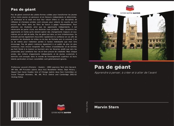 Pas de géant construit des plates-formes solides pour transformer les jeunes et les moins jeunes en penseurs et en faiseurs indépendants et déterminés. La technique et le style ont tous leur raison d'être ici. Les disciplines de réflexion et d'analyse privées sont conçues pour séduire les esprits qui ont encore des héros dans les films de tueurs à gages hollywoodiens. Pour atteindre ces étudiants ainsi que les apprenants indépendants, il est nécessaire de parler d'une voix distincte mais prudente. Mais convaincre les apprenants en herbe qu'ils doivent opérer des changements majeurs en eux-mêmes est un défi de taille. Pas de géant est donc un livre irrévérencieux. Sa brièveté permet également d'accroître rapidement la confiance en soi afin de propulser les étudiants du milieu ou du bas de l'échelle vers le sommet. Il en va de même pour l'attention portée à l'action individuelle que mon livre encourage. Pas de géant s'adresse également à un public de plus en plus nombreux, mais encore inexploité. Des milliers d'autodidactes et de familles qui font l'école à la maison se tournent vers les librairies plutôt que vers les universités pour améliorer leur vie et faire preuve de créativité. Mais chaque année, des milliers d'apprenants indépendants et de jeunes scolarisés à domicile sont envoyés dans le monde de l'enseignement supérieur où leurs talents particuliers et leurs sensibilités sont généralement ignorés.