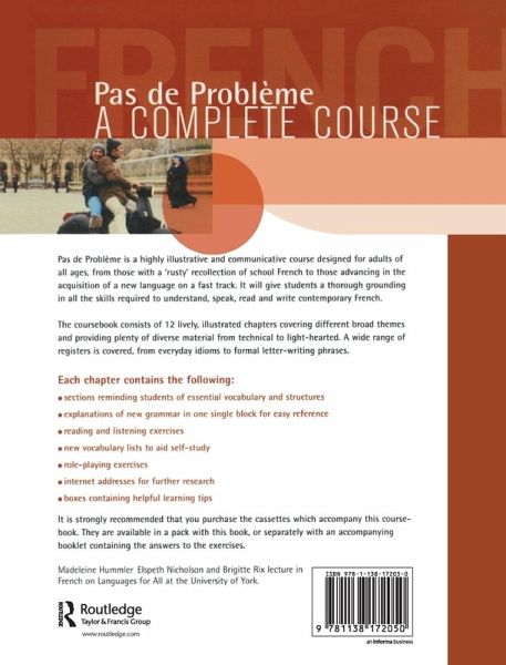 Chapter 1. Getting to know France. Describing people, places, work and study. Asking questions and saying no. Listening and extracting relevant infomation. Chapter 2. Dealing with health issues. Talking about your daily life. Saying how long, when and where. Chapter 3. Understanding and explaining procedures. Following and describing recipes and experiments. Chapter 4. Expressing the past (1). Living and working abroad. Practical life and everyday situations. Chapter 5. Word games. Charades. Cards and chess. General quiz. Quiz on France. Jokes. Chapter 6. Describing events in the past (2). Reporting on events. Life stories, biographies and histories. The cinema. Chapter 7. Technology and science. Describing how things were or used to be. Making suggestions. Saying how something was done. Chapter 8. Describing accidents and incidents in the past (3). Asking for, and giving information. Writing summaries and reports. Road safety. Chapter 9. Describing events in the past (4). Defending a position. Dealing with officials. Chapter 10. Personal and work relationships. Becoming familiar with idiomatic expressions. Games. Chapter 11. The French way of life and French customs. Describing what will happen. Talking about future plans, dreams and inventions. Chapter 12. Discussing the environment. Writing formal letters. Making hypotheses.