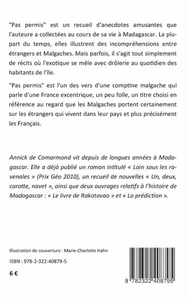 "Pas permis" est un recueil d'anecdotes amusantes que l'auteure a collectées au cours de sa vie à Madagascar. La plupart du temps, elles illustrent des incompréhensions entre étrangers et Malgaches. Mais parfois, il s'agit tout simplement de récits où l'exotique se mêle avec drôlerie au quotidien des habitants de l'île. "Pas permis" est l'un des vers d'une comptine malgache qui parle d'une France excentrique, un peu folle, un titre choisi en référence au regard que les Malgaches portent certainement sur les étrangers qui vivent dans leur pays et plus précisément les Français.