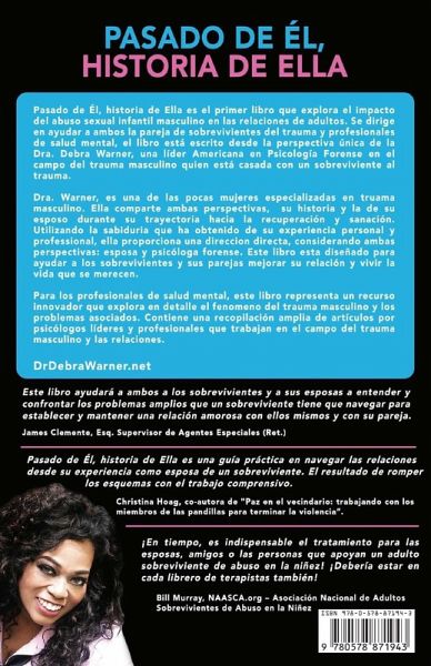 Pasado de Él, historia de Ella es el primer libro que explora el impacto del abuso sexual infantil masculino en las relaciones de adultos. Se dirige en ayudar a ambos la pareja de sobrevivientes del trauma y profesionales de salud mental, el libro está escrito desde la perspectiva única de la Dra. Debra Warner, una líder Americana en Psicología Forense en el campo del trauma masculino quien está casada con un sobreviviente al trauma. Dra. Warner, es una de las pocas mujeres especializadas en trauma masculino, comparte ambas perspectivas su historia y la de su esposo, según ellos pasan por el camino de la recuperación y sanación. Utilizando la sabiduría que ha obtenido desde la experiencia tanto personal como profesional, ella le provee una dirección manos a la obra, considerando ambas perspectivas: esposa y psicóloga forense para ayudar a los sobrevivientes y a sus parejas a mejor hacia la relación rica y satisfactoria que ellos merecen. Para los profesionales de salud mental, este libro representa un recurso innovador que explora en detalle el fenomeno del trauma masculino y los problemas asociados. Contiene una recopilación amplia de artículos por psicólogos líderes y profesionales que trabajan en el campo del trauma masculino y las relaciones.