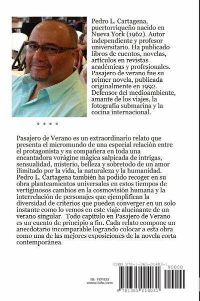 Pasajero de Verano es un extraordinario relato que presenta el micromundo de una especial relación entre el protagonista y su compañera en toda una encantadora vorágine mágica salpicada de intrigas, sensualidad, misterio, belleza y sobretodo de un amor ilimitado por la vida, la naturaleza y la humanidad. Pedro L. Cartagena también ha podido recoger en su obra planteamientos universales en estos tiempos de vertiginosos cambios en la cosmovisión humana y la interrelación de personajes que ejemplifican la diversidad de criterios que pueden converger en un solo instante como lo vemos en este viaje alucinante de un verano singular. Todo capítulo en Pasajero de Verano es un cuento de principio a fin. Cada relato compone un anecdotario incomparable logrando colocar a esta obra como una de las mejores exposiciones de la novela corta contemporánea.