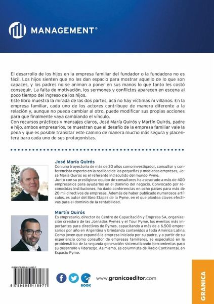 El desarrollo de los hijos en la empresa familiar del fundador o la fundadora no es fácil. Los hijos sienten que no les dan espacio para mostrar aquello de lo que son capaces, y los padres no se animan a poner en sus manos lo que tanto les costó conseguir. La falta de motivación, los sermones y conflictos aparecen en escena al poco tiempo del ingreso de los hijos. Este libro muestra la mirada de las dos partes, acá no hay víctimas ni villanos. En la empresa familiar, cada uno de los actores contribuye de manera diferente a la relación y, aunque no pueda cambiar al otro, puede modificar sus propias acciones para que finalmente vaya cambiando el vínculo. Con recursos prácticos y mensajes claros, José María Quirós y Martín Quirós, padre e hijo, ambos empresarios, te muestran que el desafío de la empresa familiar vale la pena y que es posible transitar este camino de manera mucho más segura y placentera para cada uno de sus protagonistas.José María QuirósCon una trayectoria de más de 30 años como investigador, consultor y conferencista experto en la realidad de las pequeñas y medianas empresas, José María Quirós es el referente indiscutido del mundo Pyme. Junto con su prestigioso equipo de consultores ha asesorado a más de 400 empresarios para ayudarlos en el dominio del negocio. Convocado por reconocidas instituciones, ha dado conferencias en ocho países para más de 20 mil directivos de empresas. Además de haber publicado numerosos artículos, es autor del libro Etapas de la Pyme, en el que plantea claves efectivas para el dominio de la rentabilidad. Martín Quirós Es empresario, director de Centro de Capacitación y Empresa SA, organización creadora de las Jornadas Pymes y el Tour Pyme, los eventos más importantes para directivos de Pymes, capacitando a más de a 6.500 empresarios por año en Argentina y brindando contenidos a toda América Latina. Como joven que expandió la empresa iniciada por su padre, y a partir de su experiencia como consultor de empresas familiares, se especializó en la problemática.