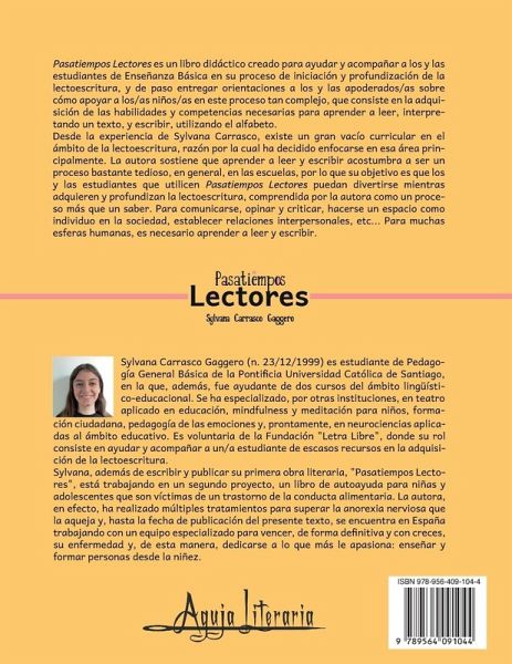 Sylvana Carrasco Gaggero (n. 23/12/1999) es estudiante de Pedagogía General Básica de la Pontificia Universidad Católica de Santiago, en la que, además, fue ayudante de dos cursos del ámbito lingüístico-educacional. Se ha especializado, por otras instituciones, en teatro aplicado en educación, mindfulness y meditación para niños, formación ciudadana, pedagogía de las emociones y, prontamente, en neurociencias aplicadas al ámbito educativo. Es voluntaria de la Fundación "Letra Libre", donde su rol consiste en ayudar y acompañar a un/a estudiante de escasos recursos en la adquisición de la lectoescritura. Sylvana, además de escribir y publicar su primera obra literaria, "Pasatiempos Lectores", está trabajando en un segundo proyecto, un libro de autoayuda para niñas y adolescentes que son víctimas de un trastorno de la conducta alimentaria. La autora, en efecto, ha realizado múltiples tratamientos para superar la anorexia nerviosa que la aqueja y, hasta la fecha de publicación del presente texto, se encuentra en España trabajando con un equipo especializado para vencer, de forma definitiva y con creces, su enfermedad y, de esta manera, dedicarse a lo que más le apasiona: enseñar y formar personas desde la niñez.