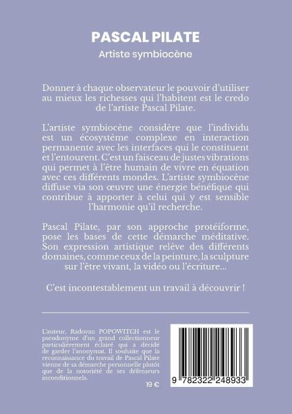 Donner à chaque observateur le pouvoir d'utiliser au mieux les richesses qui l'habitent, est le credo de l'artiste Pascal PilateL'artiste symbiocène considère que l'individu est un écosystème complexe en interaction permanente avec les interfaces qui le constituent et l'entourent. C'est un faisceau de justes vibrations qui permet à l'être humain de vivre en équation avec ces différents mondes. L'artiste symbiocène diffuse via son oeuvre une énergie bénéfique qui contribue à apporter à celui qui y est sensible l'harmonie qu'il recherche.Pascal Pilate, par son approche protéiforme, pose les bases de cette démarche méditative. Son expression artistique relève des différents domaines, comme ceux de la peinture,la sculpture sur l'être vivant, la video ou l'écriture.C'est incontestablement un travail à découvrir.