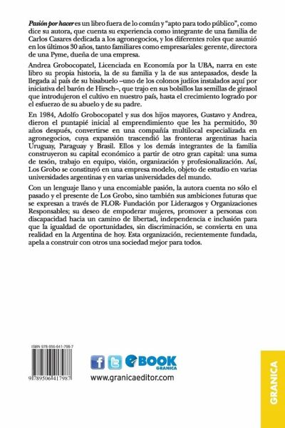 Pasión por hacer es un libro fuera de lo común y apto para todo público , como dice su autora, que cuenta su experiencia como integrante de una familia de Carlos Casares dedicada a los agronegocios, y los diferentes roles que asumió en los últimos 30 años, tanto familiares como empresariales: gerente, directora de una pyme, dueña de una empresa.Andrea Grobocopatel, Licenciada en Economía por la UBA, narra en este libro su propia historia, la de su familia y la de sus antepasados, desde la llegada al país de su bisabuelo, uno de los colonos judíos instalados aquí por iniciativa del barón de Hirsch, que trajo en sus bolsillos las semillas de girasol que introdujeron el cultivo en nuestro país, hasta el crecimiento logrado por el esfuerzo de su abuelo y de su padre.En 1984, Adolfo Grobocopatel y sus dos hijos mayores, Gustavo y Andrea, dieron el puntapié inicial al emprendimiento que les ha permitido 30 años despues, convertirse en una compañía multilocal especializada en agronegocios, cuya expansión trascendió las fronteras argentinas hacia Uruguay, Paraguay y Brasil. Ellos y los demás integrantes de la f