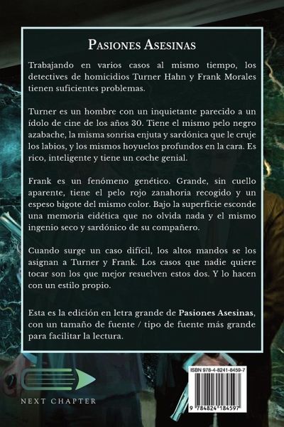 Trabajando en varios casos al mismo tiempo, los detectives de homicidios Turner Hahn y Frank Morales tienen suficientes problemas. Turner es un hombre con un inquietante parecido a un ídolo de cine de los años 30. Tiene el mismo pelo negro azabache, la misma sonrisa enjuta y sardónica que le cruje los labios, y los mismos hoyuelos profundos en la cara. Es rico, inteligente y tiene un coche genial. Frank es un fenómeno genético. Grande, sin cuello aparente, tiene el pelo rojo zanahoria recogido y un espeso bigote del mismo color. Bajo la superficie esconde una memoria eidética que no olvida nada y el mismo ingenio seco y sardónico de su compañero. Cuando surge un caso difícil, los altos mandos se los asignan a Turner y Frank. Los casos que nadie quiere tocar son los que mejor resuelven estos dos. Y lo hacen con un estilo propio. Esta es la edición en letra grande de Pasiones Asesinas, con un tamaño de fuente / tipo de fuente más grande para facilitar la lectura.