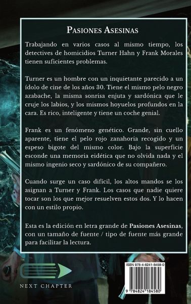 Trabajando en varios casos al mismo tiempo, los detectives de homicidios Turner Hahn y Frank Morales tienen suficientes problemas. Turner es un hombre con un inquietante parecido a un ídolo de cine de los años 30. Tiene el mismo pelo negro azabache, la misma sonrisa enjuta y sardónica que le cruje los labios, y los mismos hoyuelos profundos en la cara. Es rico, inteligente y tiene un coche genial. Frank es un fenómeno genético. Grande, sin cuello aparente, tiene el pelo rojo zanahoria recogido y un espeso bigote del mismo color. Bajo la superficie esconde una memoria eidética que no olvida nada y el mismo ingenio seco y sardónico de su compañero. Cuando surge un caso difícil, los altos mandos se los asignan a Turner y Frank. Los casos que nadie quiere tocar son los que mejor resuelven estos dos. Y lo hacen con un estilo propio. Esta es la edición en letra grande de Pasiones Asesinas, con un tamaño de fuente / tipo de fuente más grande para facilitar la lectura.