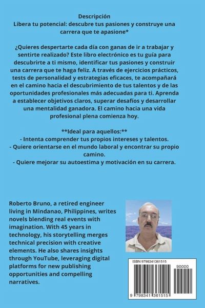 Descripción Libera tu potencial: descubre tus pasiones y construye una carrera que te apasione* ¿Quieres despertarte cada día con ganas de ir a trabajar y sentirte realizado? Este libro electrónico es tu guía para descubrirte a ti mismo, identificar tus pasiones y construir una carrera que te haga feliz. A través de ejercicios prácticos, tests de personalidad y estrategias eficaces, te acompañará en el camino hacia el descubrimiento de tus talentos y de las oportunidades profesionales más adecuadas para ti. Aprenda a establecer objetivos claros, superar desafíos y desarrollar una mentalidad ganadora. El camino hacia una vida profesional plena comienza hoy.