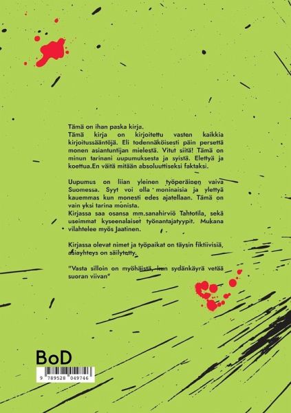 Tämä on ihan paska kirja. Tämä kirja on kirjoitettu vasten kaikkia kirjoitussääntöjä. Eli todennäköisesti päin persettä monen asiantuntijan mielestä. Vitut siitä! Tämä on minun tarinani uupumuksesta ja syistä. Elettyä ja koettua.En väitä mitään absoluuttiseksi faktaksi. Uupumus on liian yleinen työperäinen vaiva Suomessa. Syyt voi olla moninaisia ja ylettyä kauemmas kun monesti edes ajatellaan. Tämä on vain yksi tarina monista. Kirjassa saa osansa mm.sanahirviö Tahtotila, sekä useimmat kyseenalaiset työnantajatyypit. Mukana vilahtelee myös Jaatinen. Kirjassa olevat nimet ja työpaikat on täysin fiktiivisiä, asiayhteys on säilytetty. "Vasta silloin on myöhäistä, kun sydänkäyrä vetää suoran viivan"