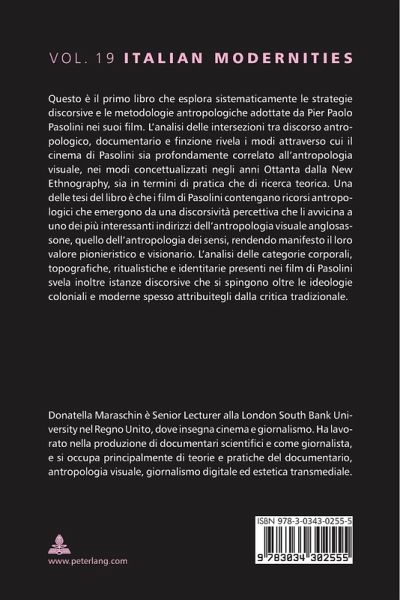 Questo è il primo libro che esplora sistematicamente le strategie discorsive e le metodologie antropologiche adottate da Pier Paolo Pasolini nei suoi film. L'analisi delle intersezioni tra discorso antropologico, documentario e finzione rivela i modi attraverso cui il cinema di Pasolini sia profondamente correlato all'antropologia visuale, nei modi concettualizzati negli anni Ottanta dalla New Ethnography, sia in termini di pratica che di ricerca teorica. Una delle tesi del libro è che i film di Pasolini contengano ricorsi antropologici che emergono da una discorsività percettiva che li avvicina a uno dei più interessanti indirizzi dell'antropologia visuale anglosassone, quello dell'antropologia dei sensi, rendendo manifesto il loro valore pionieristico e visionario. L'analisi delle categorie corporali, topografiche, ritualistiche e identitarie presenti nei film di Pasolini svela inoltre istanze discorsive che si spingono oltre le ideologie coloniali e moderne spesso attribuitegli dalla critica tradizionale.