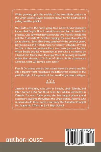 While growing up in the middle of the twentieth century in the Virgin Islands, Boysie becomes known for his boldness and pulling creative pranks. Mr. Smith owns the finest genip tree in East End and already knows that Boysie likes to sneak into his orchard to taste the produce. One day when Boysie recruits two friends to help him pick the fruit while Mr. Smith is napping, the adventure doesn't go as planned. Soon after being punished for his previous prank, Boysie makes an ill-fated choice to "borrow" a bundle of wood for his mother and realizes there are consequences for lies. When Boysie decides to learn how to swim, he is mentored by a friend who teaches him the importance of believing in himself rather than showing off in front of others. As his experiences continue, what will Boysie learn next? Pass It On shares stories that weave historical events and life into a tapestry that recaptures the bittersweet essence of the past lifestyle of the people of two small Virgin Islands villages.