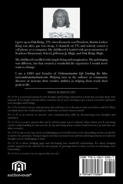 I grew up in Oak Ridge, TN. when Kennedy was President, Martin Luther King was alive, gas was cheap, you got 3 channels on TV, and a vinyl record wasn't a collectable item. I was extremely shy in my youth and most people saw me as being a "quiet, funny and likeable kid". I have always had a love for the arts and can't remember not drawing or being creative. I remember my kindergarten teacher from Scarboro Elementary School being amazed by my ability to draw even before I could really write. But it was my English teacher from Jefferson Jr. High (Ms. Nolan) who thought I had a talent for writing. She wrote me a note back in 1969 expressing her view on my writing abilities and planted a seed that stayed with me about writing a book of poetry. Since then, I have written 2 children's book called "My Little Red Book" and "My Little Green Book" (both written and illustrated by me), and took part in a book project of 39 other writers called "Ordinary Men, Extraordinary Lives: Defining Moments". I have always had a great love for people and understanding human behavior. I love connecting with people. My sense of humor and how I see life has always made me different from those around me, which I know I got from my mom. She was well-known for being a person who really lived, loved, and laughed no matter how bad the situation was in life. I, too, tend to be the same way. I am the CEO and founder of UNDERCONSTRUCTION: Life Coaching For Men (www.underconstructionlifecoaching.com). Underconstruction is a life coaching tool to help men discover and increase their own creative nature. I really hope you'll enjoy your journey with PASS IT ON!