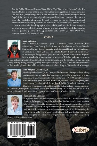 One Man, One Canoe, Nineteen Friends, One Majestic River! Pass the Paddle: Mississippi Dreamin' Come Hell or High Water is Jerry Schumm's (aka the Paddlin' Pastor) memoir of his journey down the Mississippi River. It was an excursion like no other. Jerry never paddled alone. Friends and family members signed up for "legs" of the river. A ceremonial paddle was passed from one canoeist to the next-a giant relay. For fellow adventurers, the book provides a day-by-day documentation of the Mississippi River voyage from the headwaters at Lake Itasca to New Orleans. It also is the story of family, friendship, spirituality, and the goodness of folks met along the way. More importantly, it is the tale of a man who has the qualities needed to actualize a life-long dream: positive attitude, persistence, and patience.