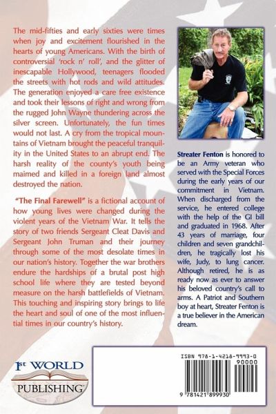 The mid-fifties and early sixties were times when joy and excitement flourished in the hearts of young Americans. With the birth of controversial 'rock n' roll', and the glitter of inescapable Hollywood, teenagers flooded the streets with hot rods and wild attitudes. The generation enjoyed a care free existence and took their lessons of right and wrong from the rugged John Wayne thundering across the silver screen. Unfortunately, the fun times would not last. A cry from the tropical mountains of Vietnam brought the peaceful tranquility in the United States to an abrupt end. The harsh reality of the country's youth being maimed and killed in a foreign land almost destroyed the nation. "The Final Farewell" is a fictional account of how young lives were changed during the violent years of the Vietnam War. It tells the story of two friends Sergeant Cleat Davis and Sergeant John Truman and their journey through some of the most desolate times in our nation's history. Together the war brothers endure the hardships of a brutal post high school life where they are tested beyond measure on the harsh battlefields of Vietnam. This touching and inspiring story brings to life the heart and soul of one of the most influential times in our country's history.