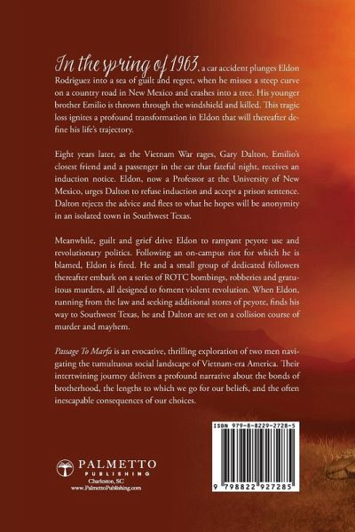 Against the tumultuous backdrop of the 1970s Vietnam war era, Passage To Marfa plunges readers into a gripping journey of escape, radical politics, and revenge. Gary Dalton, a conflicted University of New Mexico dropout, finds himself caught between his draft board and a vendetta pursued by Eldon Rodriguez, a Marxist revolutionary and his one-time mentor. Fleeing to Marfa, Texas, and hoped-for anonymity, Dalton is introduced to a burgeoning art scene by the illusive Amy De Castro. Just as he begins to feel safe in this isolated desert community, a botched drug deal brings Rodriguez in relentless pursuit. Their climactic confrontation unfolds on Black Mountain, in the rugged Gila Wilderness of New Mexico. Passage To Marfa depicts characters whose lives are turned upside down by a power-seeking revolutionary posing as a liberator. The novel asks whether human suffering is a necessary condition of life, something immune to utopian schemes and political machinations of all kinds.