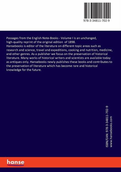 Passages from the English Note-Books - Volume I is an unchanged, high-quality reprint of the original edition of 1898.Hansebooks is editor of the literature on different topic areas such as research and science, travel and expeditions, cooking and nutrition, medicine, and other genres. As a publisher we focus on the preservation of historical literature. Many works of historical writers and scientists are available today as antiques only. Hansebooks newly publishes these books and contributes to the preservation of literature which has become rare and historical knowledge for the future.